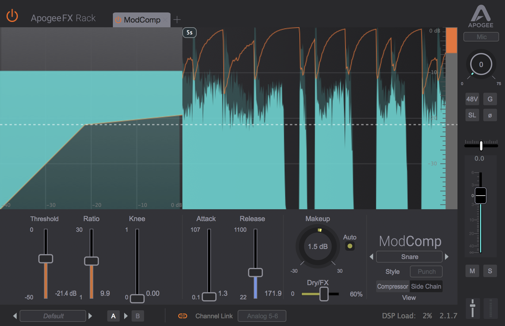 ModComp is a modern visual compressor and limiter plugin that is part of the Apogee FX Rack suite of plugins that runs natively in your favorite macOS DAW without any Apogee hardware but also has DualPath™ functionality that allows the plugins to run on Apogee Hardware DSP in Element Series and Ensemble Thunderbolt audio interfaces.